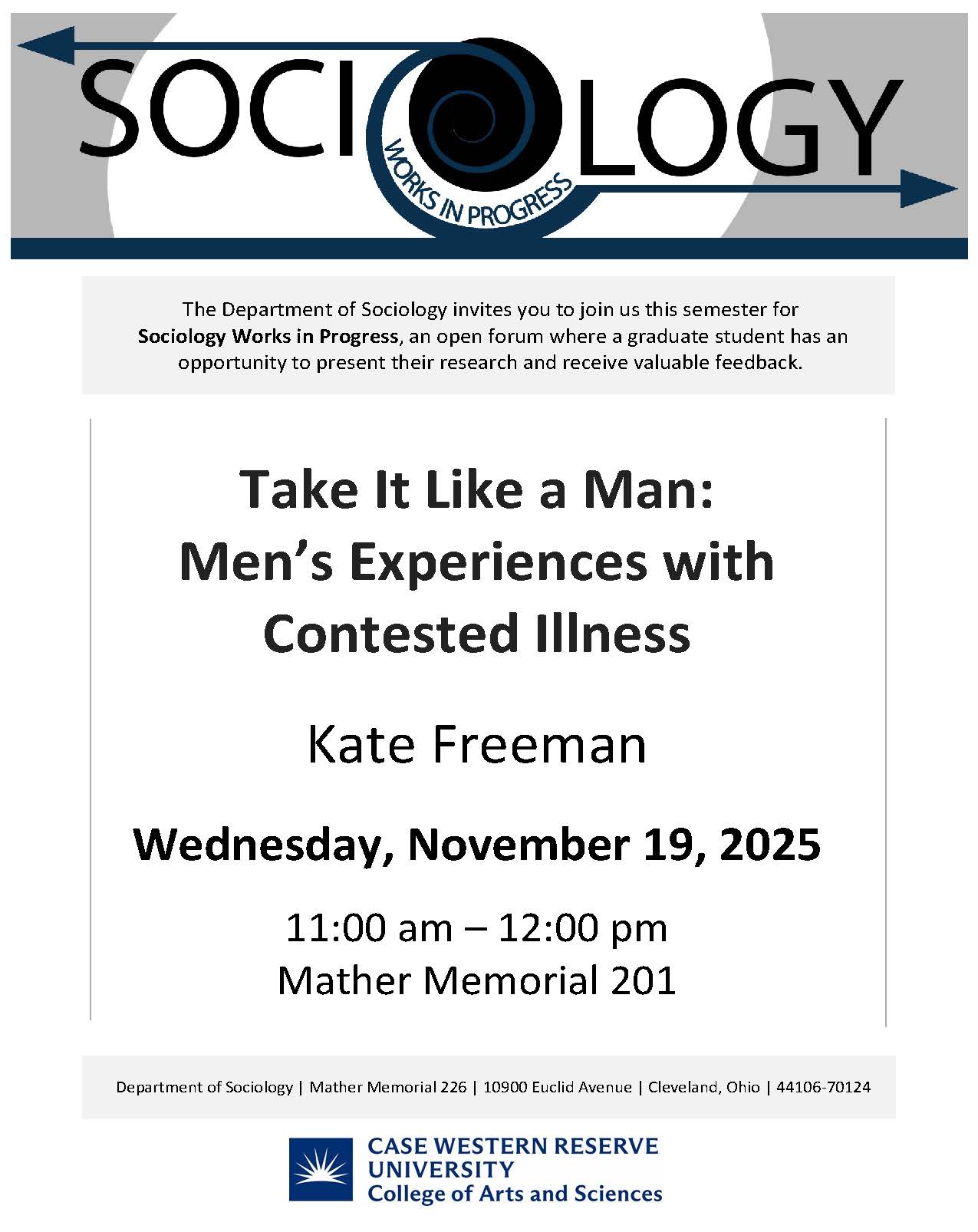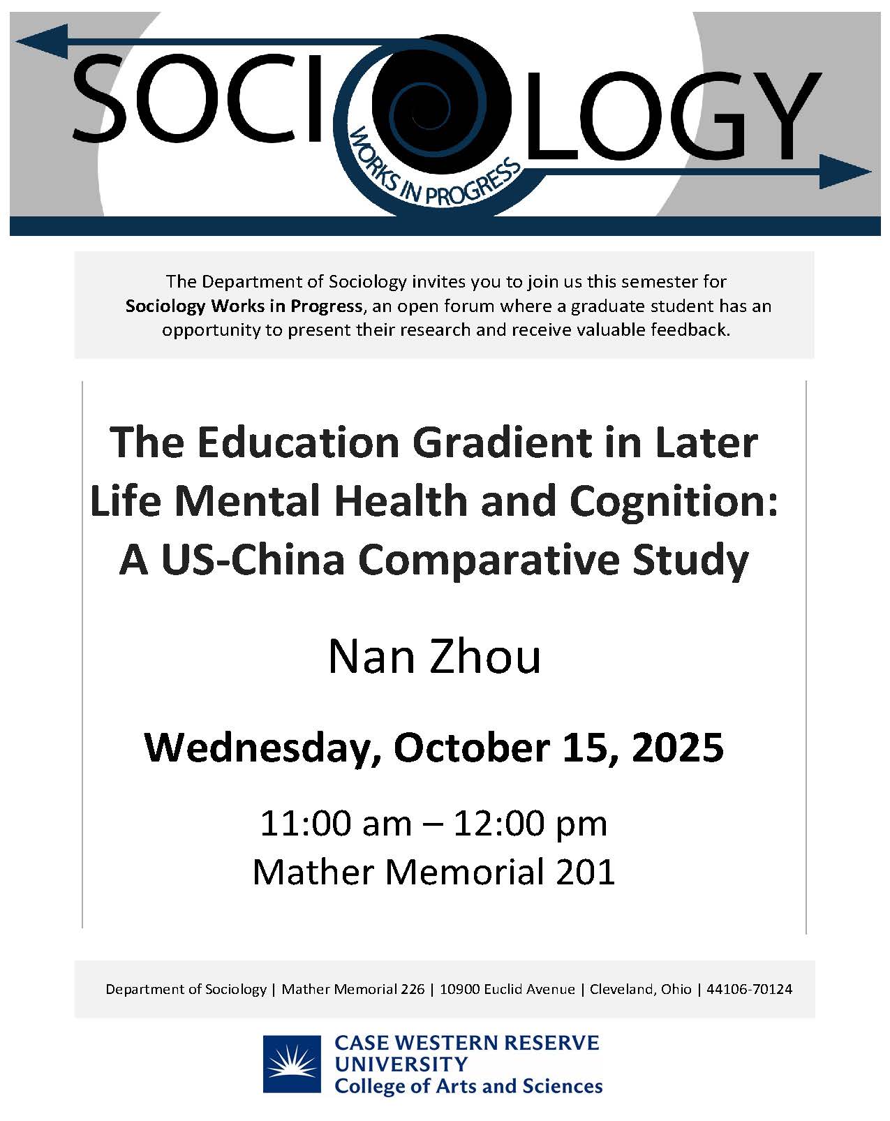 Works-in-Progress-Semester-announcement-Fall-25 The Department of Sociology invites you to join us this Fall Semester for two Sociology Works in Progress, open forums where a graduate student has an opportunity to present their research and receive valuable feedback. Nan Zhou will present his work on October 15 and Kate Freeman will present her work on November 19. |