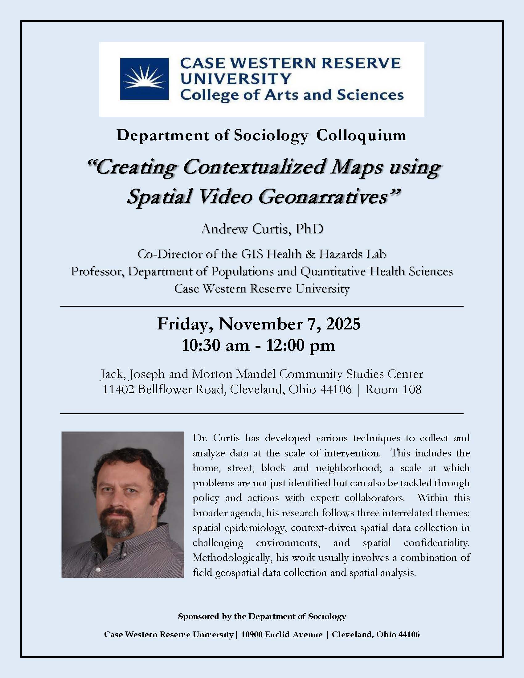 Please join us for Dr. Andrew Curtis’ colloquium, “Creating Contextualized Maps using Spatial Vieo Geonarratives” on Friday, November 7 from 10:30 to 12:00 PM at the Jack, Joseph, and Morton Mandel Center, room 108. Refreshments will be provided! |